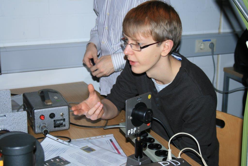 Die Schülerinnen und Schüler führen die Experimente bei uns unter Anleitung von erfahreren Studierenden in der Endphase des Lehramtsstudiums selbständig durch. Sie bauen die Experimente teilweise selbst auf, messen sorgfältig, protokollieren die Ergebnisse und tauschen sich über die Beobachtungen, Ergebnisse und Lösungen der gestellten Aufgaben aus und festigen so das abiturrelevante Wissen aus dem Bereich der Atomphysik.